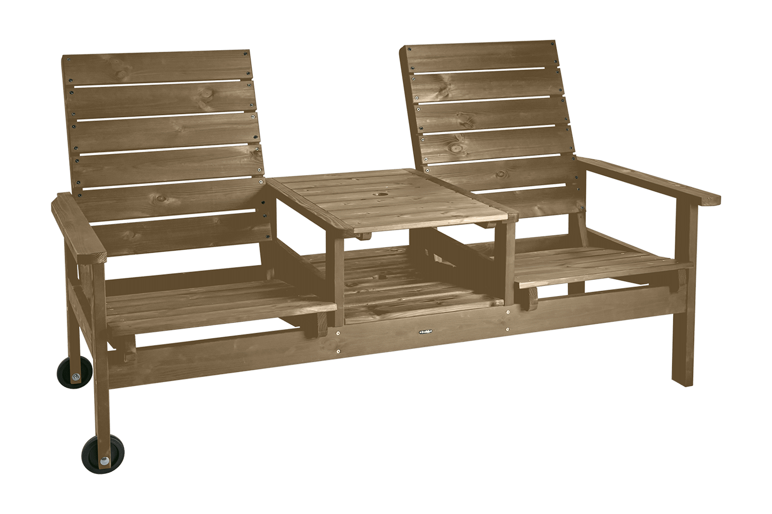 Den klassiska Du&Ja-möbeln för två är ställbar i tre lägen och har hjul för enkel förflyttning. Tillverkad i brunimpregnerad furu. Komplettera med till exempel Iduna Hammockdynaför extra sittkomfort. Hål i bord för parasoll.