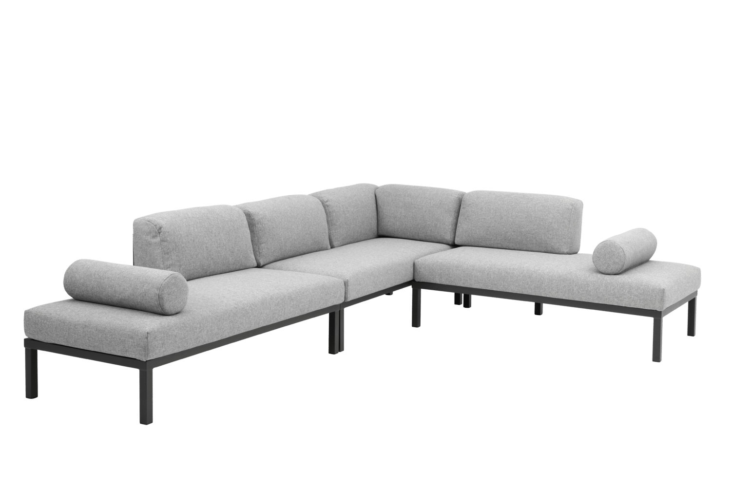 Gonesse är en modern byggbar loungegrupp som består av endast tre delar, en bakdel med hörnlösning och två lösa identiska 2-sitsdelar. Ryggstödet har en öppen konstruktion. Gonesse kan användas som en traditionell hörngrupp med de lösa armstödskuddarna som avslut eller nackkudde. Setet kan också byggas om till en solsäng för två. Komplettera med tillhörande sidobord och hylla. Sidobordet har smart funktion för placering av glas och är flexibelt då du kan ha det som extra soffbord eller dra in det över soffan. Hyllan fäster du lätt på baksidan och har samma smarta funktion som sidobordet för placering av glas. Design Hugo De Ruiter.