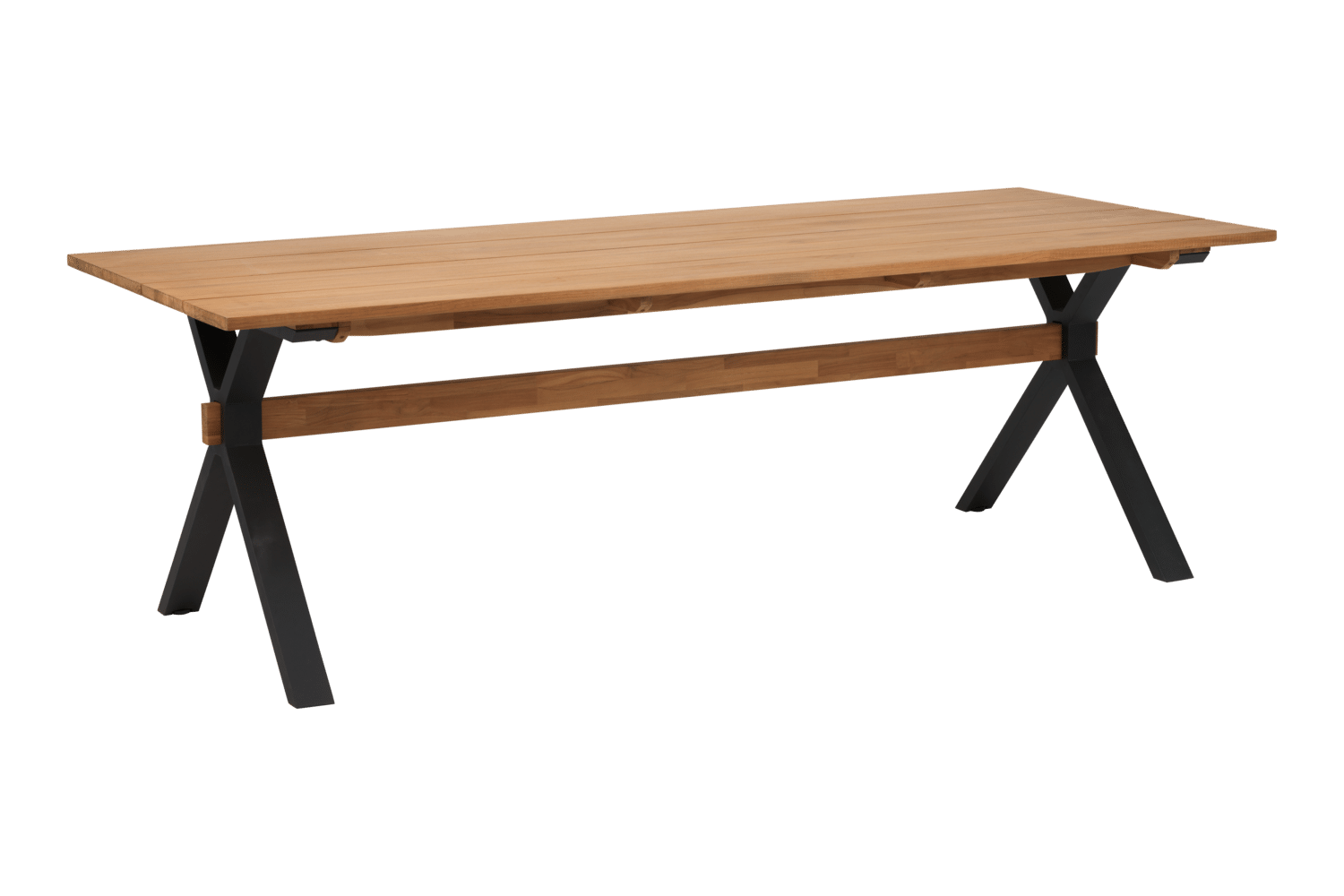 Mark är ett matbord där rustik värme möter industriell känsla. Den massiva teakskivan kombineras med kryssben i aluminium och skapar en kraftfull mix av naturligt och modernt. Justerbara fötter säkerställer stabilitet även på ojämnt underlag.