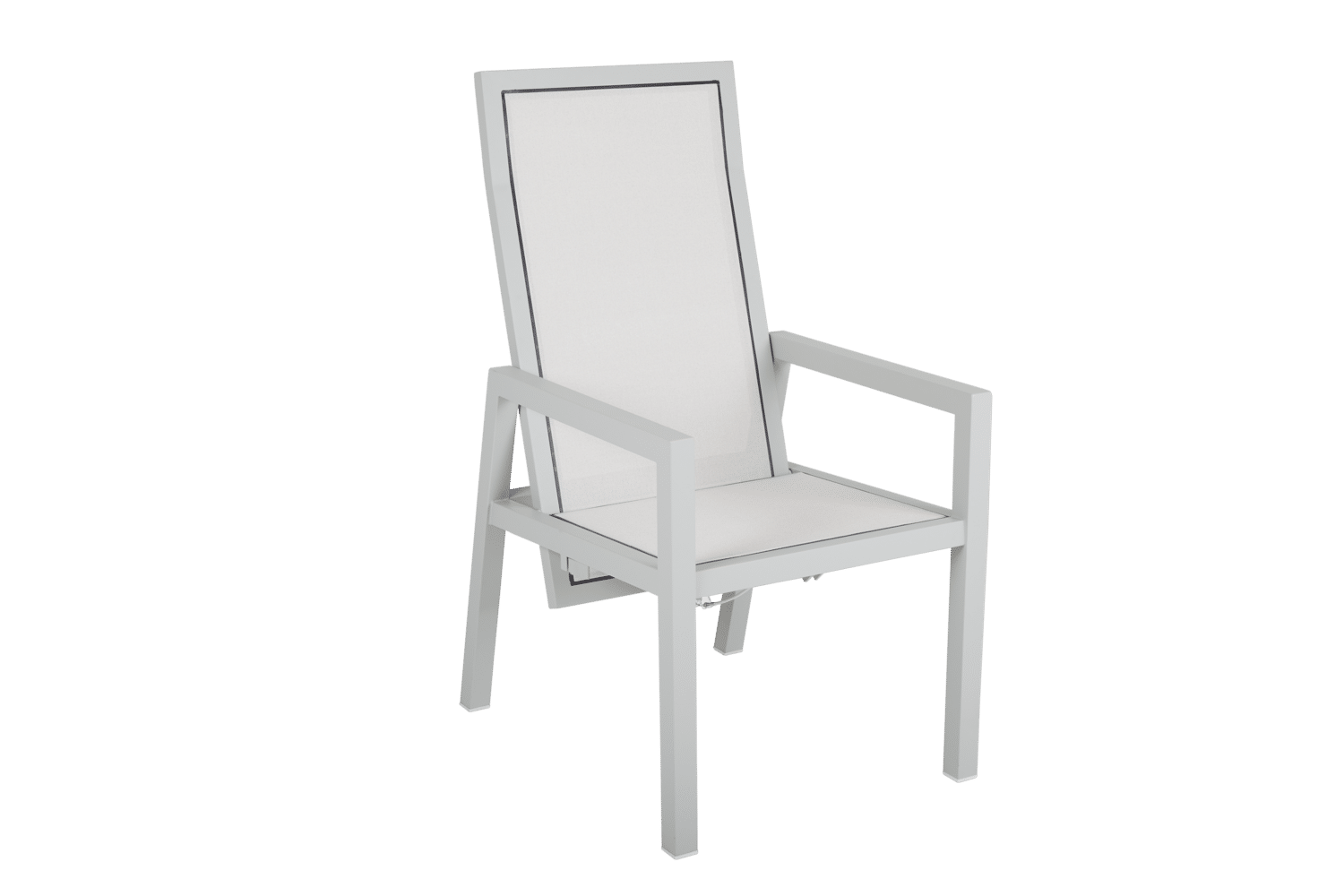 En positionsstol med stomme i pulverlackerad aluminium. Ryggen och sits är försett med slitstark textilene. Måtten har maximerats för att passa både upprätta samtal och nedfällda avkopplingar. För extra komfort: addera en sittdyna, förslagsvis från serien Iduna. Newfort passar utmärkt till borden Lomma, Lyon, Nox och Hillmond.