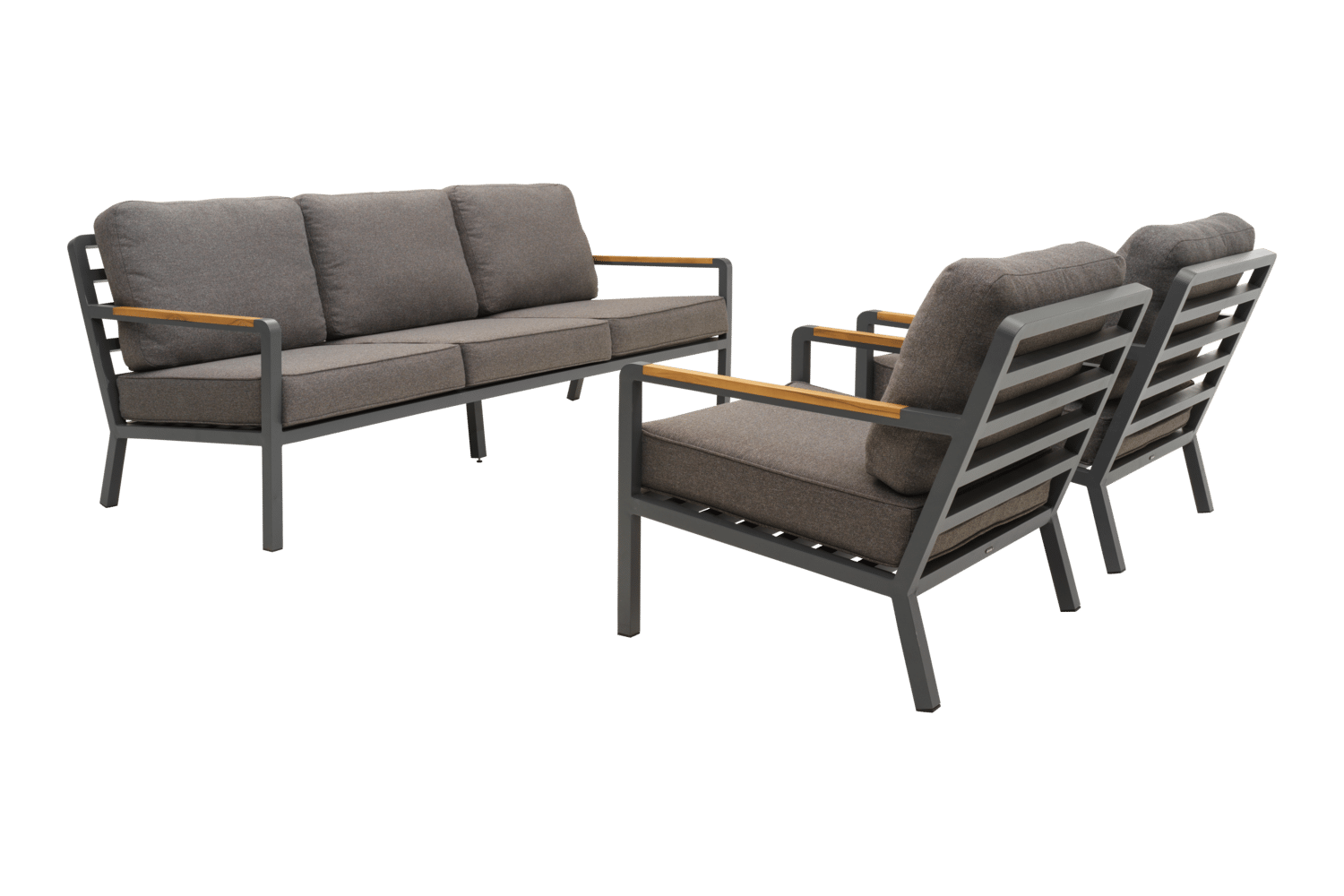 En modern loungeserie med sofistikerat uttryck. Den djupa sitsen och dynorna med vattenavvisande TPU-liner ger bestående komfort och praktisk funktion. Den generösa lutningen förstärker känslan av avkoppling, medan inlägg i massiv teak på armstöden tillför naturlig värme och en elegant kontrast mot aluminiumramen. Serien går dessutom att stapla för enkel förvaring.