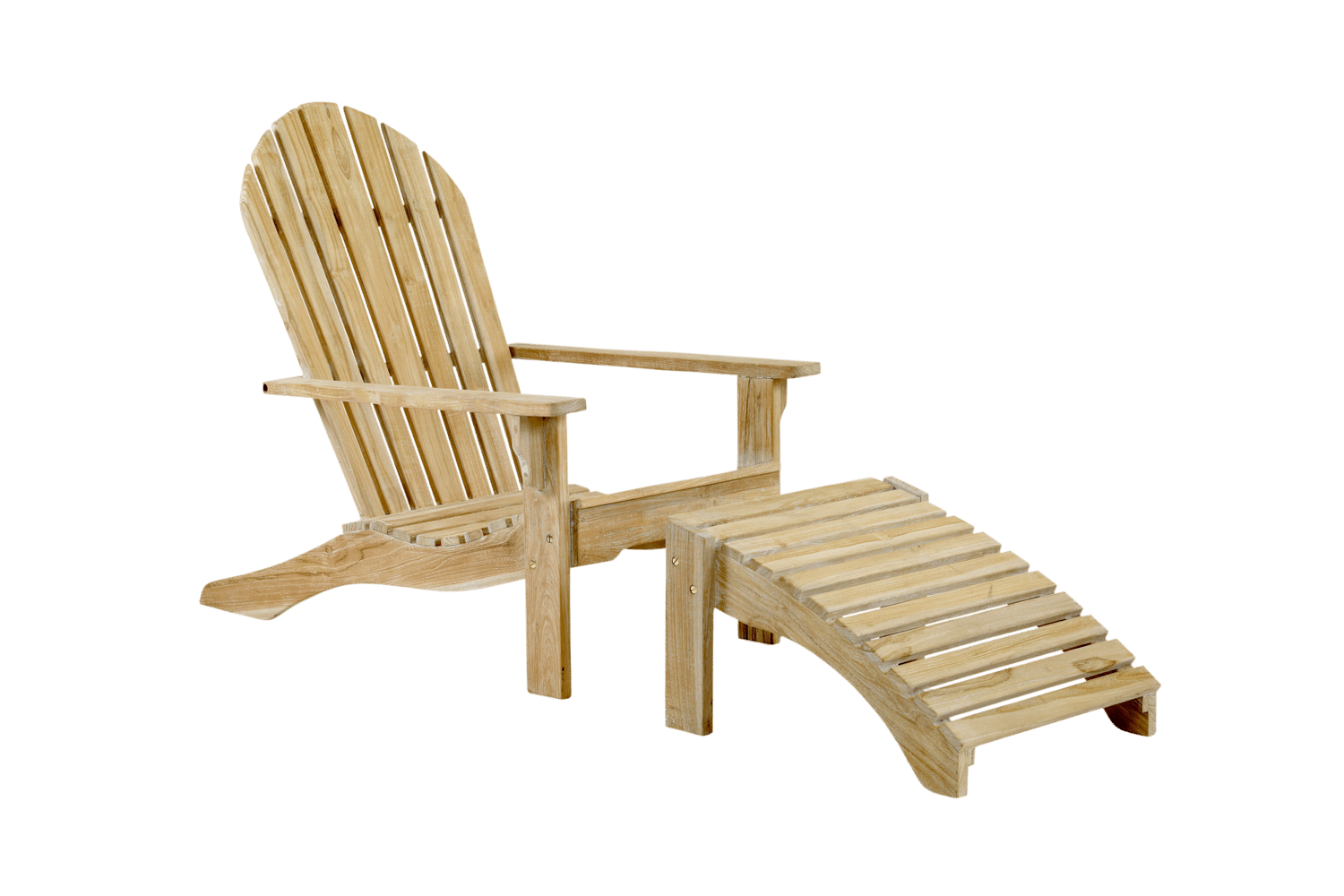 Den klassiska vilstolen i Adirondackmodell och det lilla fyrkantiga fällbordet i vitpigmenterad teak är en perfekt match.