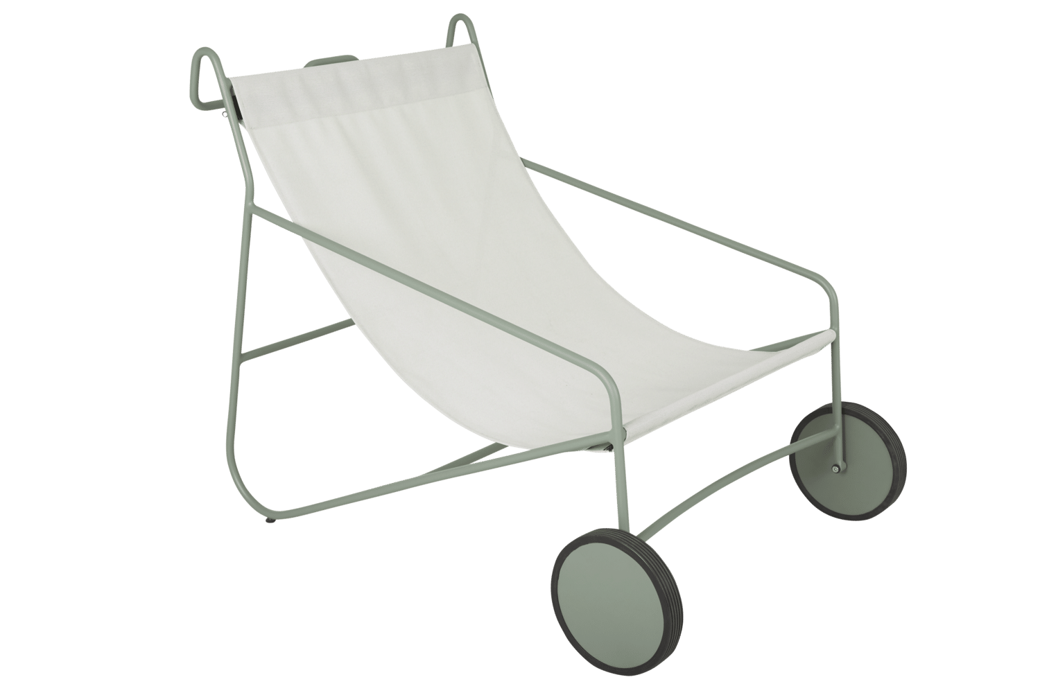 En unik loungestol med glimten i ögat. Rulla din viloplats dit du vill ha den med hjälp av hjulen och den smarta stången baktill – som även dubbeljobbar som krok när du behöver hänga ifrån dig din handduk, skjorta eller solhatt. Behöver du tvätta tygsisten går den enkelt att ta av tack vare en dragkedja.